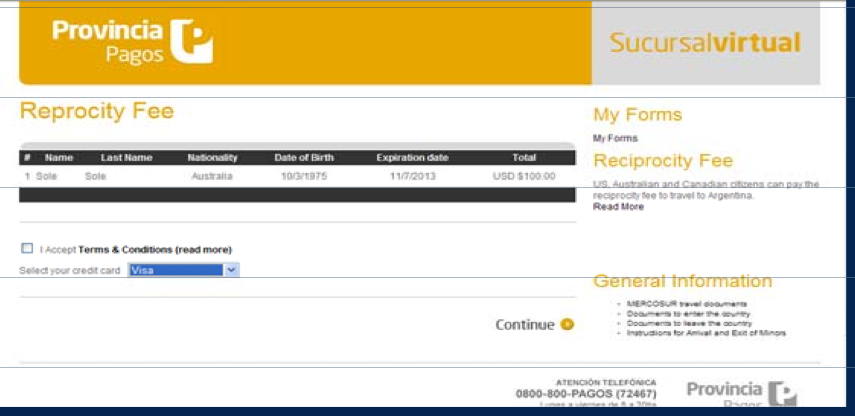A new rule has struck town for Americans, Australians and Canadians wishing to visit Argentina. It’s not new that citizens of those countries pay a fare, but the latest modification is they need to pay this (Australians: $100; Americans: $160; Canadians: $75) fare electronically before they arrive in Argentina. It’s a pain in the backside given the site you visit is given in rather complex Spanish before you finally track down where you pay your money. I strongly recommend visiting the site mentioned below and paying before you arrive. Some airlines will not let you board your plane in your origin if you don’t provide proof of payment. This proof is given upon completion of your payment.